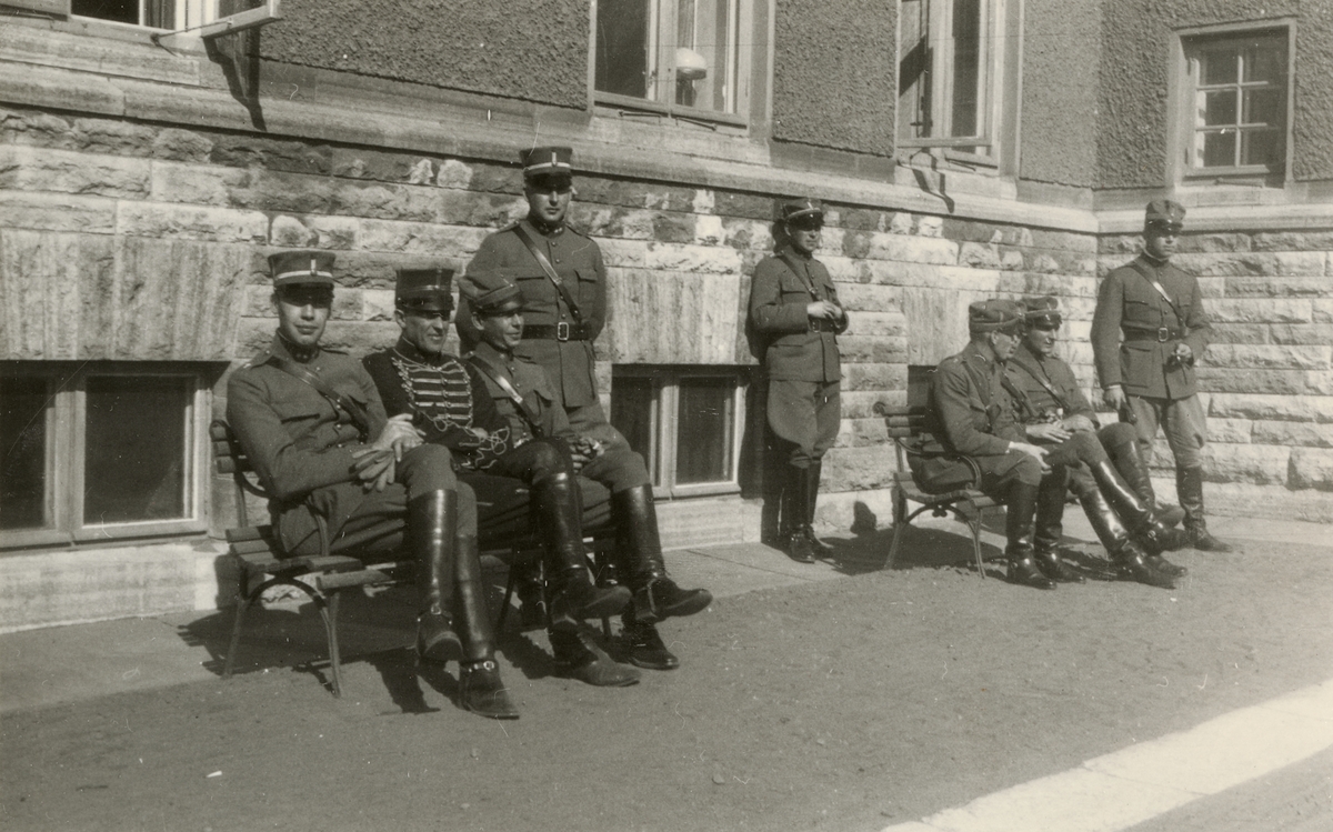 Titel: Soldater från Kavalleriskolan framför en byggnad.