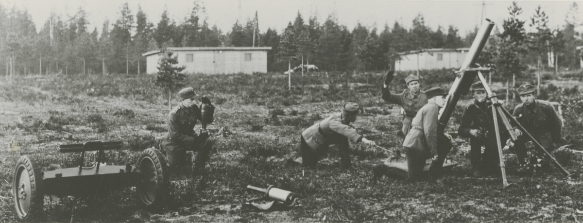 Skjutning med 12 cm granatkastare m/1941 på fält, med transportlavett vid sidan.