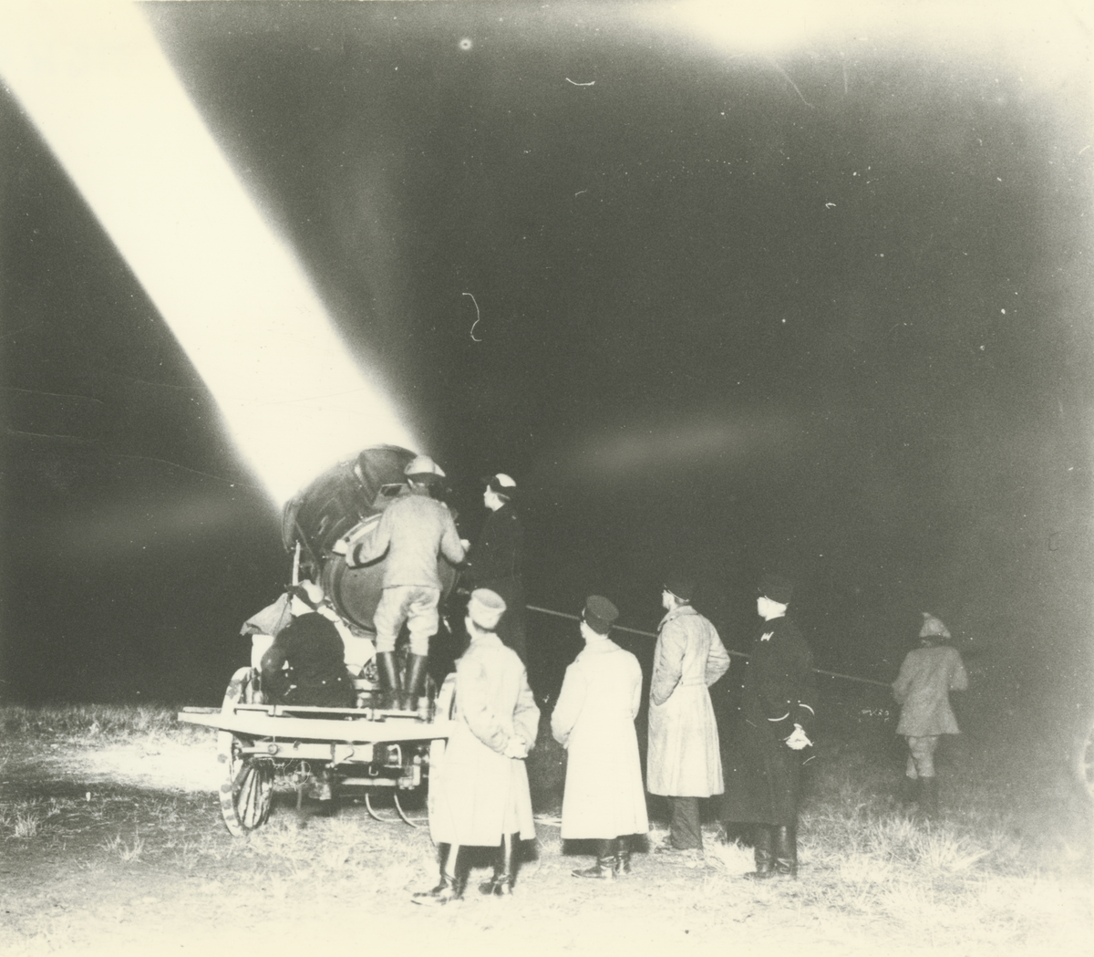 150 cm strålkastare m/1937, som lyser mot skyn.