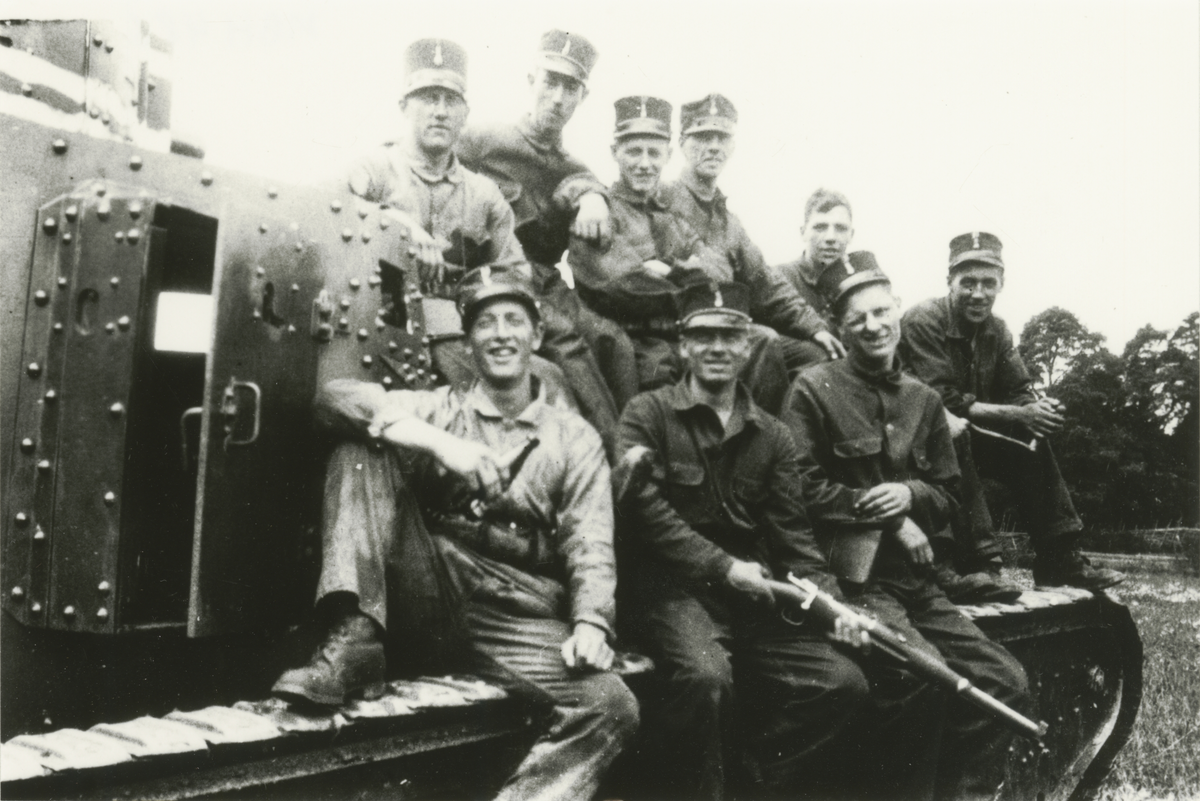 Stridsvagn m/1921, soldater sitter på motorhuven.