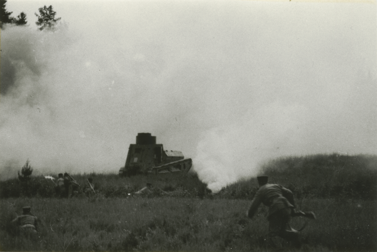 Titel: Stridsvagn m/1921 kör över fält mot en rökridå.