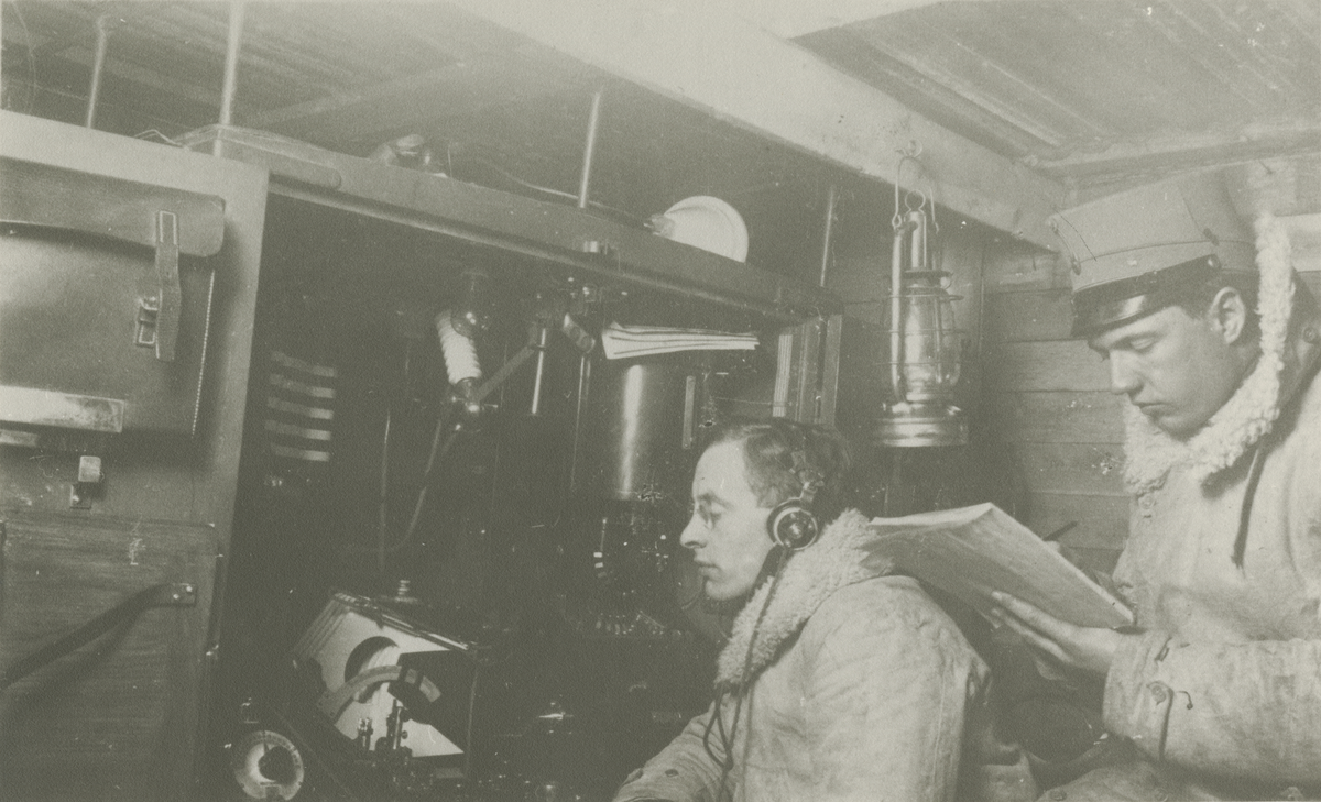 Titel: Två män i vintermundering sitter i en koja med en radiosändare.