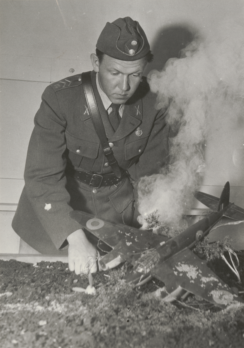 En man ur Älvsborgs regemente (I 15) betraktar en modell av en nedskjuten DH Mosquito i ett landskap, iförd uniform m/1960.