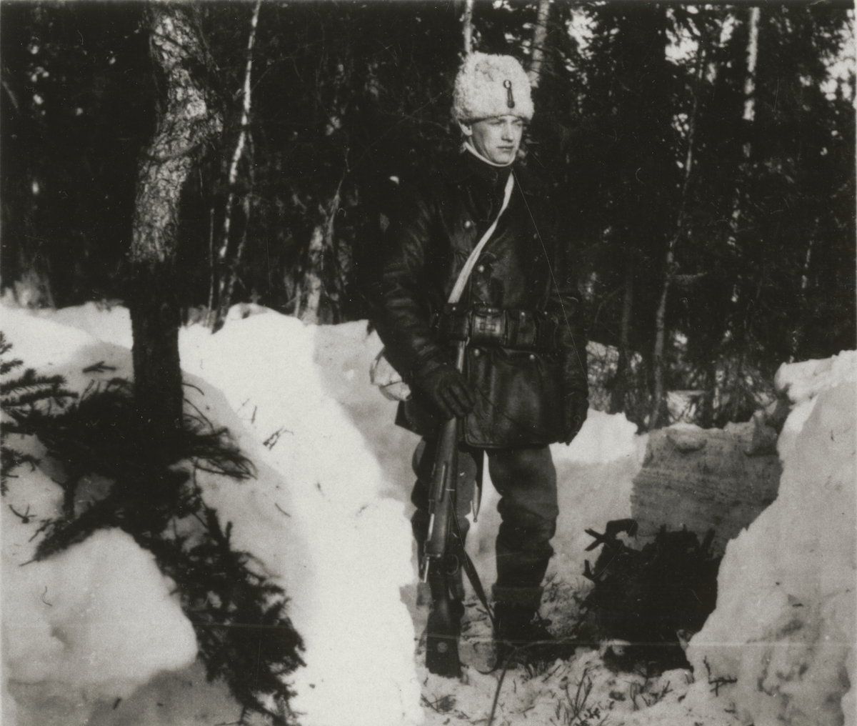 Titel: Vaktpost med pälsmössa i skogen.