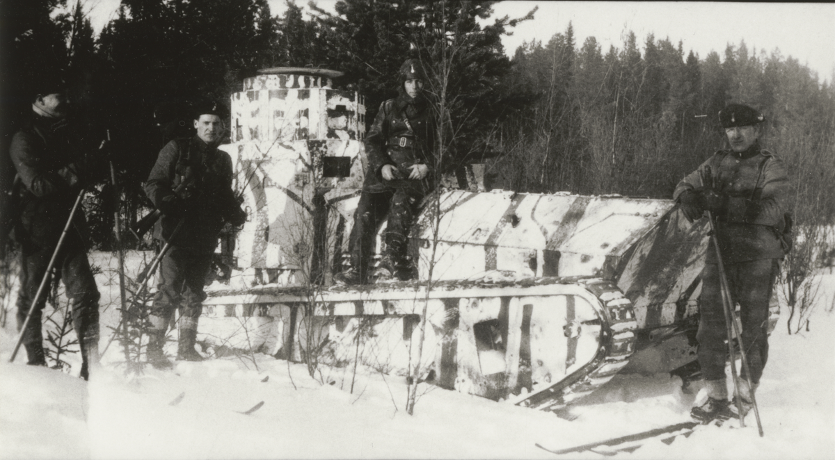 Titel: Vinterkamouflerad stridsvagn m/1921 vid skogsbryn.