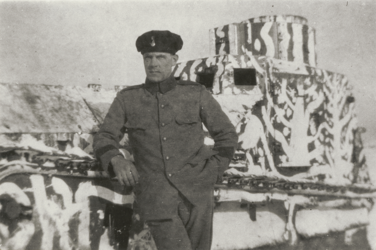 Titel: Man med skärmmössa vid vinterkamouflerad stridsvagn m/1921.