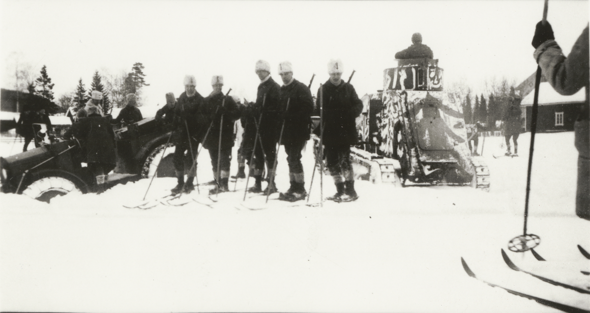 Bil fast i snödriva på gård, med soldater och stridsvagn m/1921.