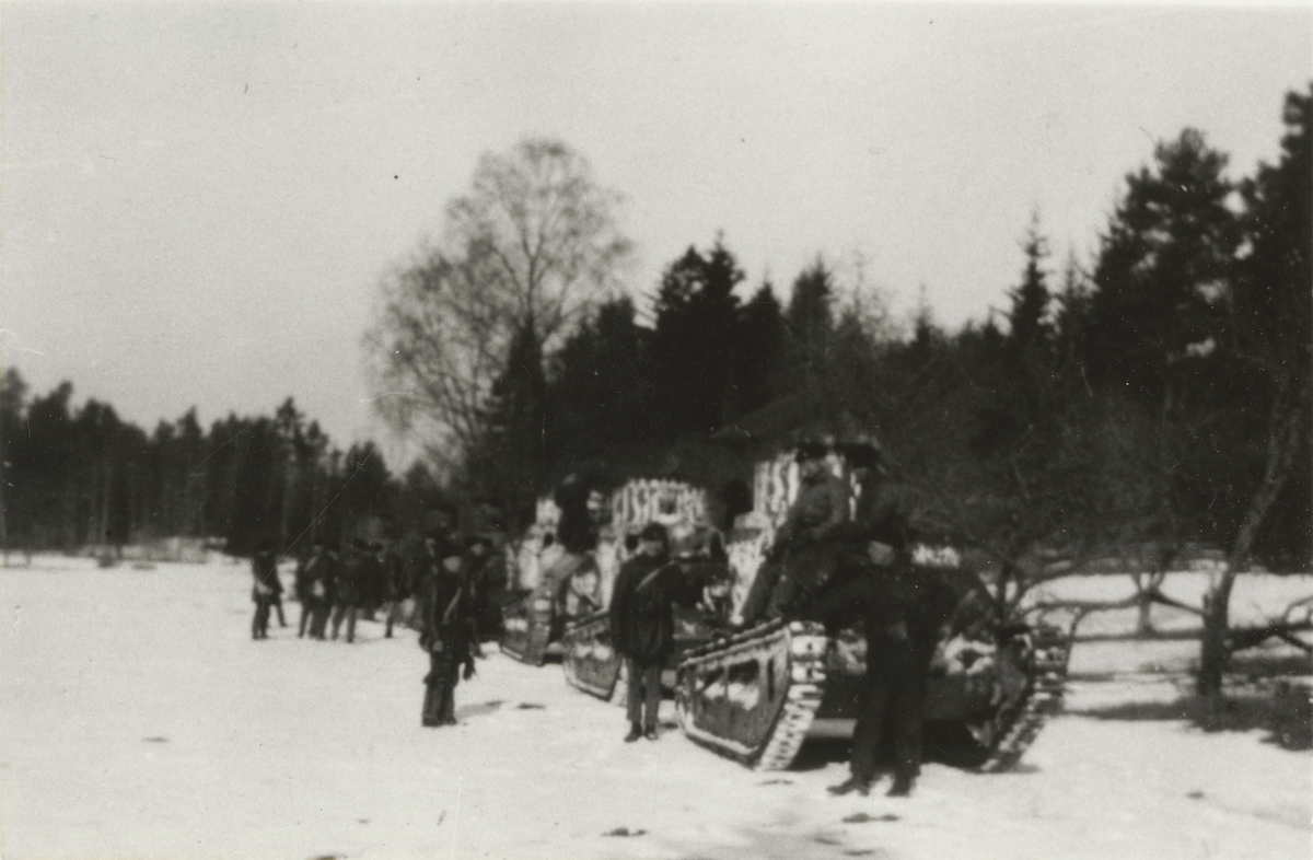Titel: Tre vinterkamouflerade stridsvagnar m/1921 på skogsväg.