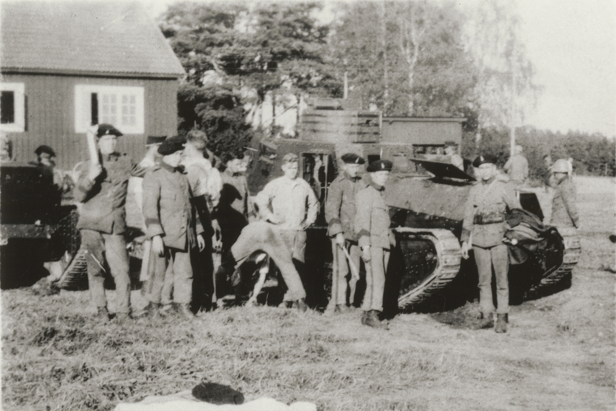 Titel: Stridsvagn m/1921 med manskap vid hus.