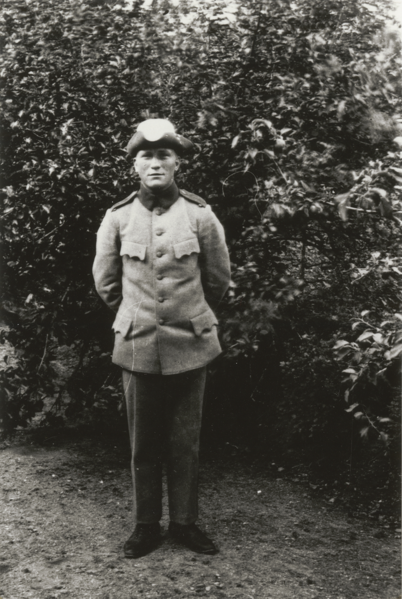 Titel: Soldat framför buskage,