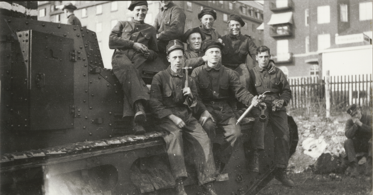 Titel: Grupp på motorhuv till stridsvagn m/1921 i stad.