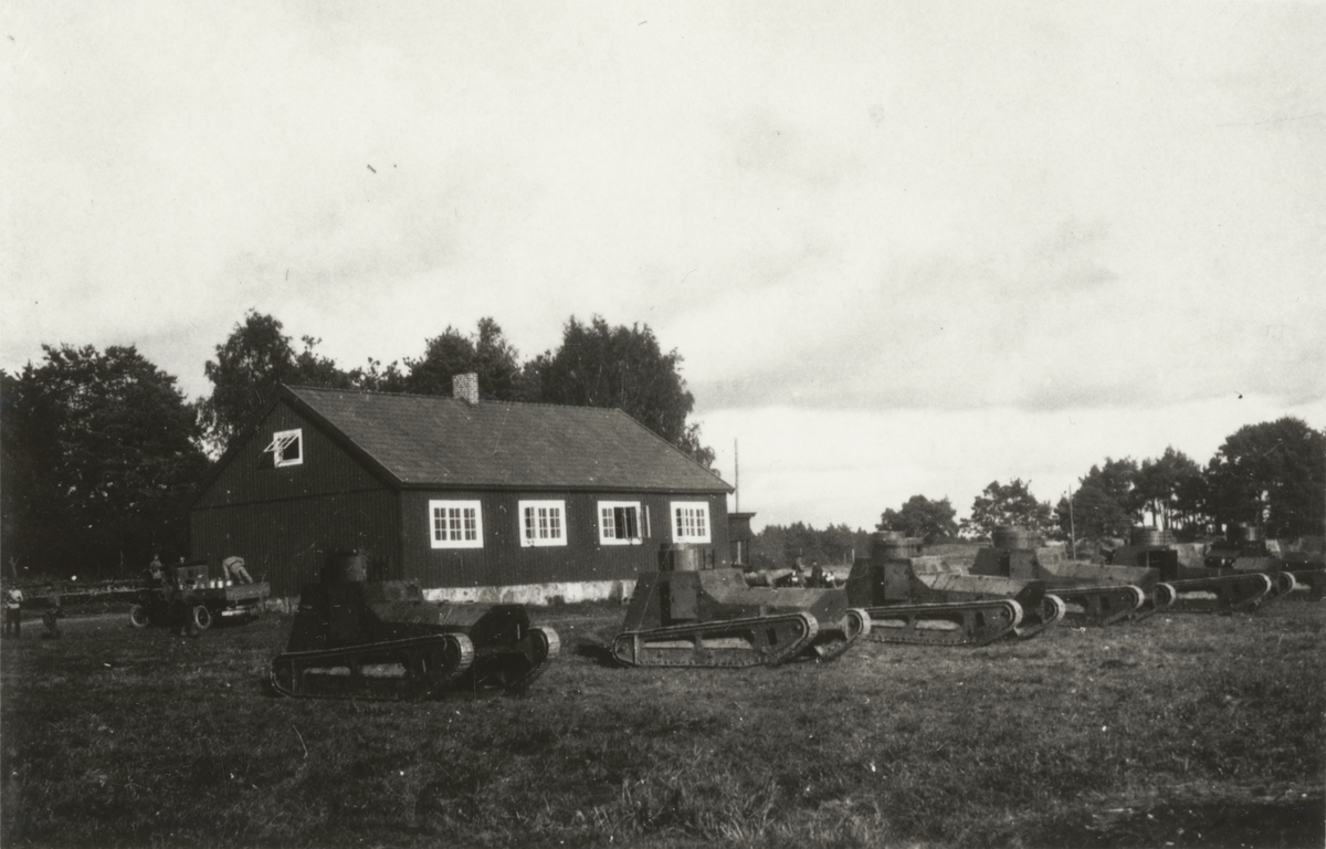 Titel: Stridsvagnar m/1921 parkerade på fält vid ett hus.