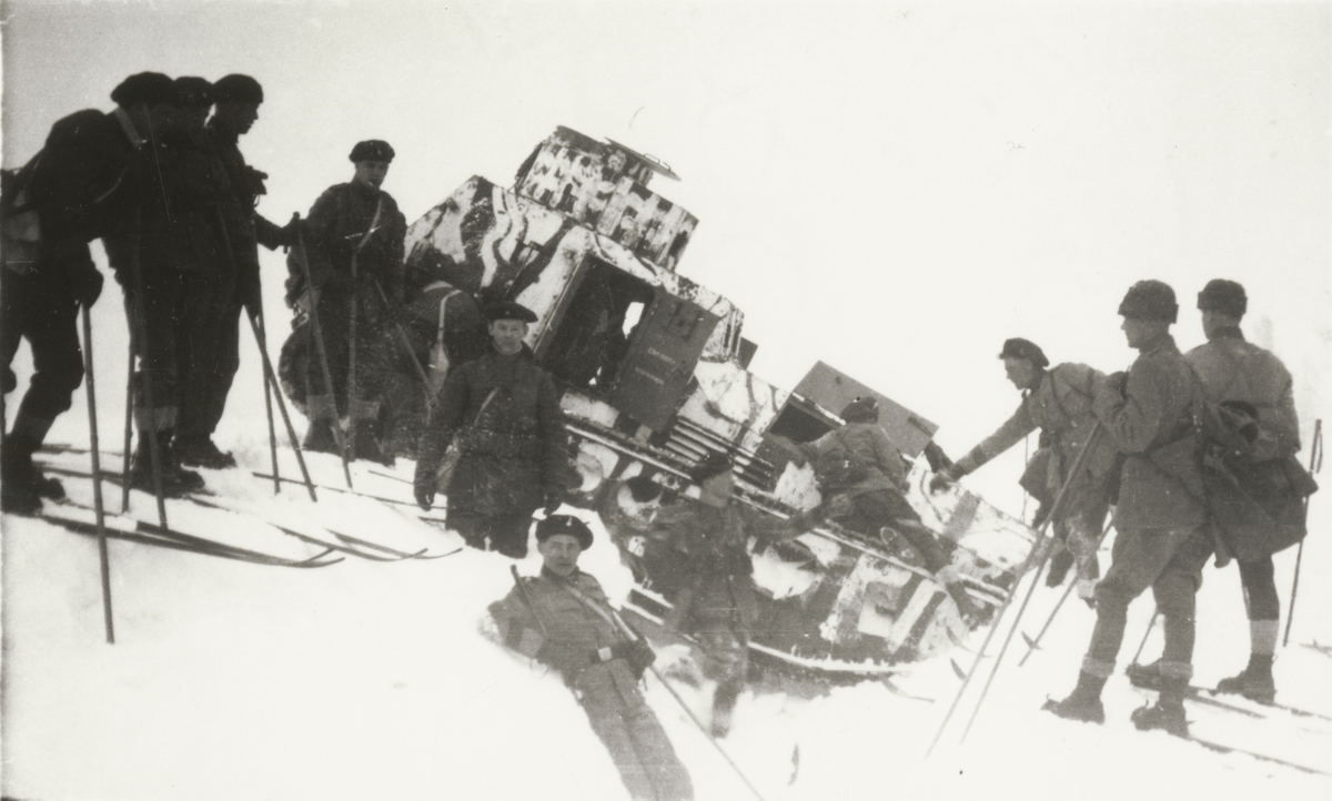 Stridsvagn m/1921 har kört ner i ett dike, skidförsedda soldater ser på.