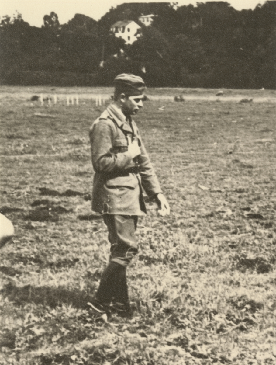 Soldat går över ett fält, ca 1940-tal.