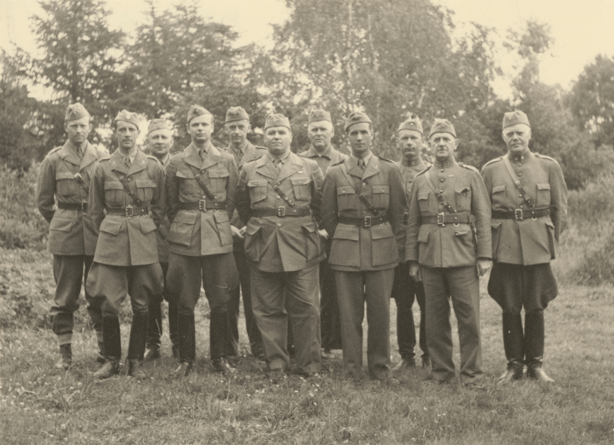 Titel: Grupp uppställd vid ett skogsbryn.
