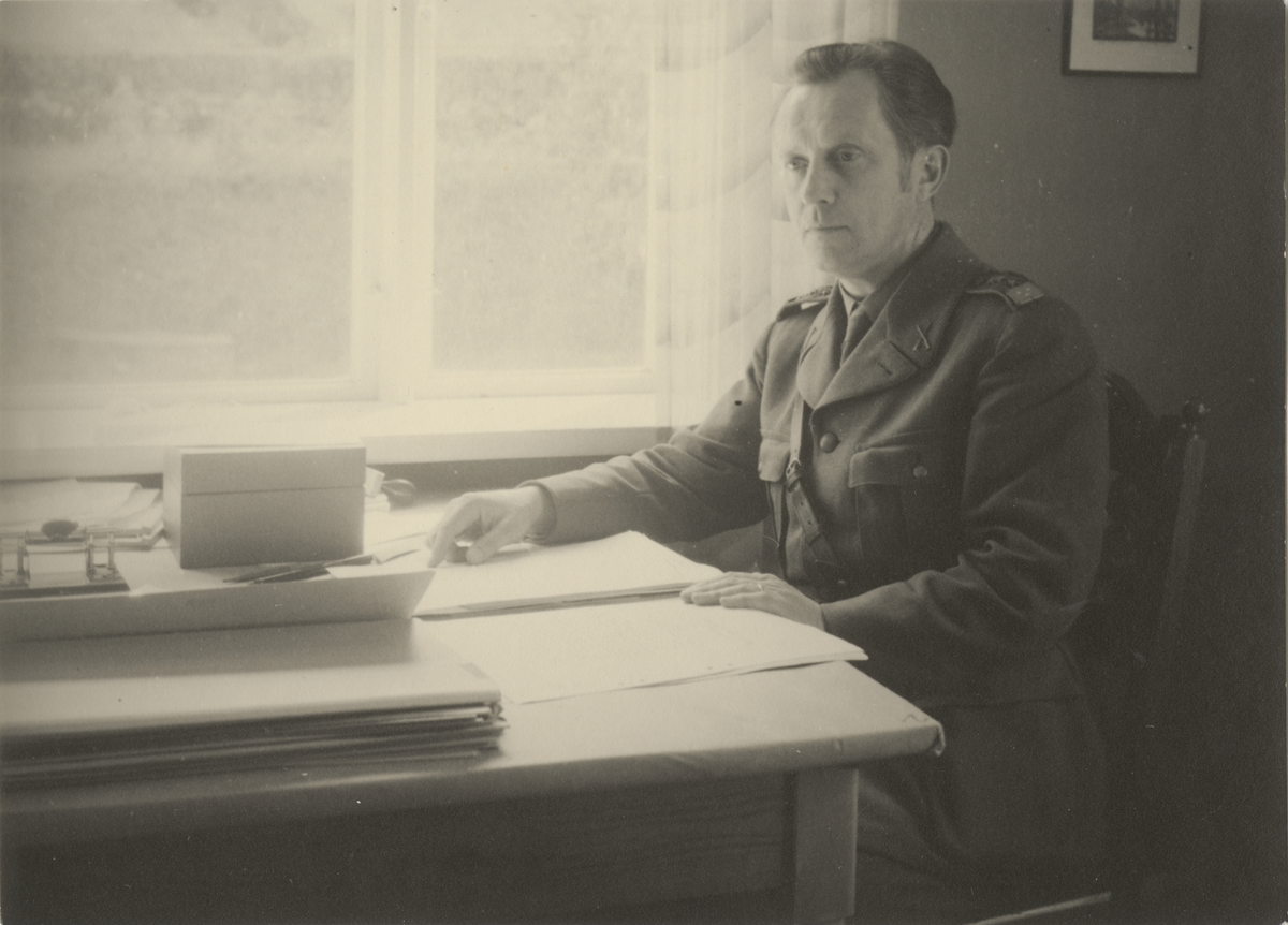 Soldat sitter vid ett skrivbord och läser dokument, 1940-talet.
