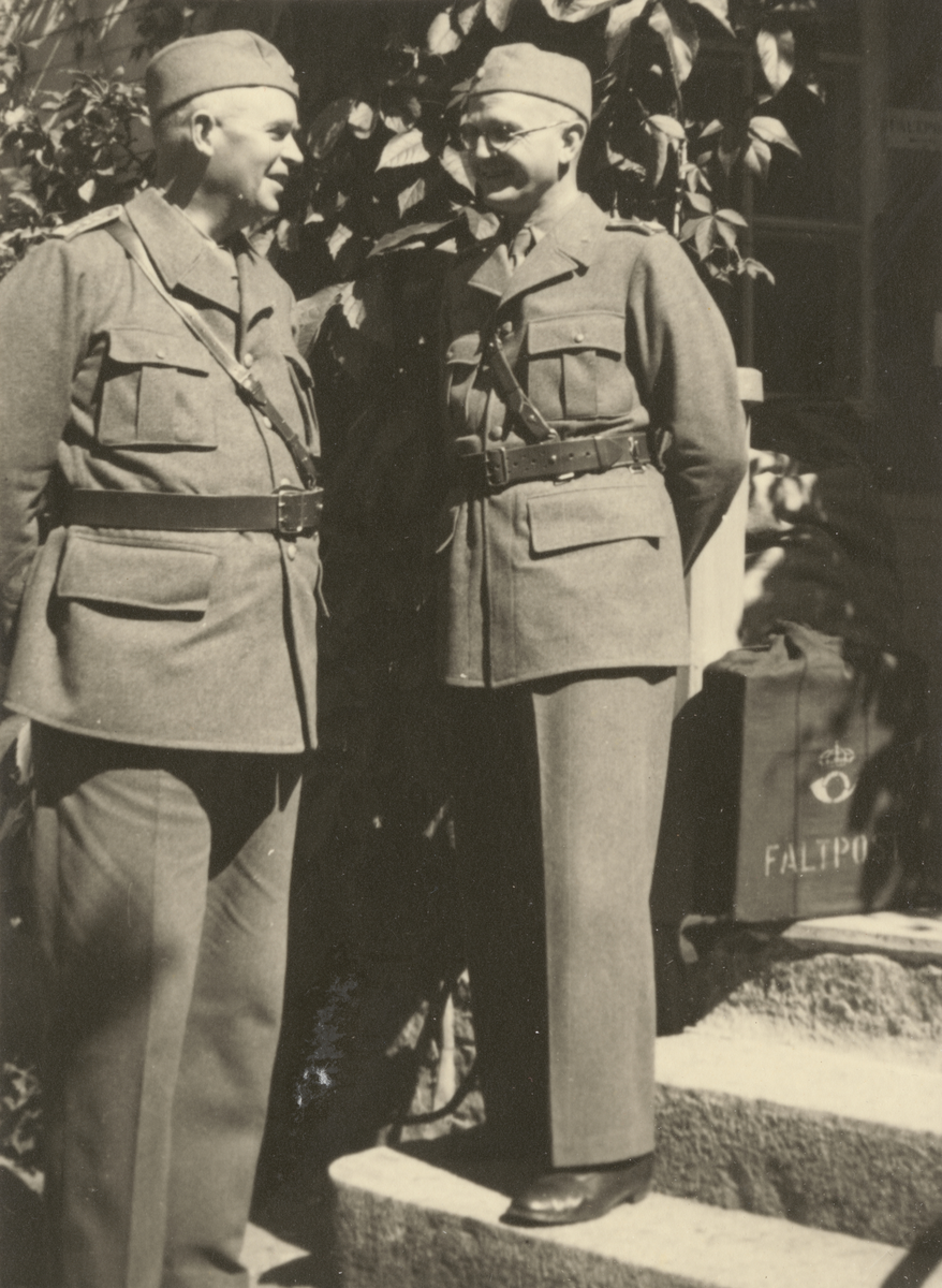 Två officerare i samspråk på trappan till ett hus med fältpostlåda, 1940-tal.
