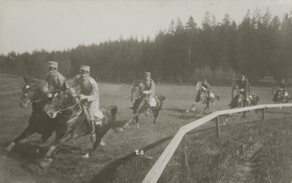 Titel: Ryttare i full galopp rundar ett staket på fält.