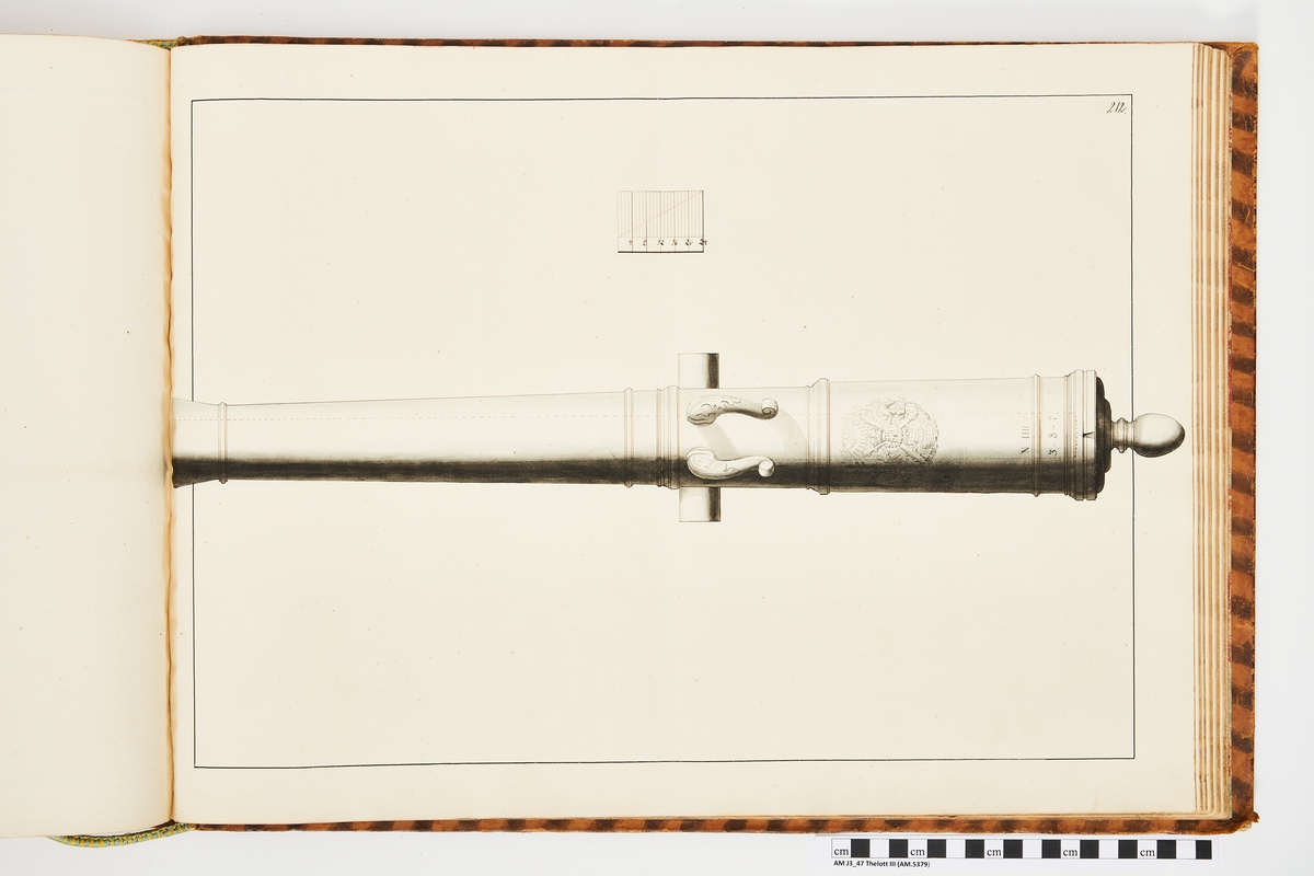 Titel: Avbildning föreställande spansk trofé tagen vid Mainz 1632. Ingår i volym med avbildade äldre svenska eldrör förvarade på fästningar samt eldrör erövrade åren 1598-1679.