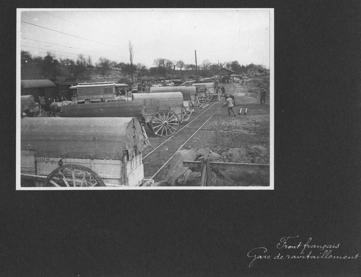 Titel: Transportvagnar vid järnvägsstation.