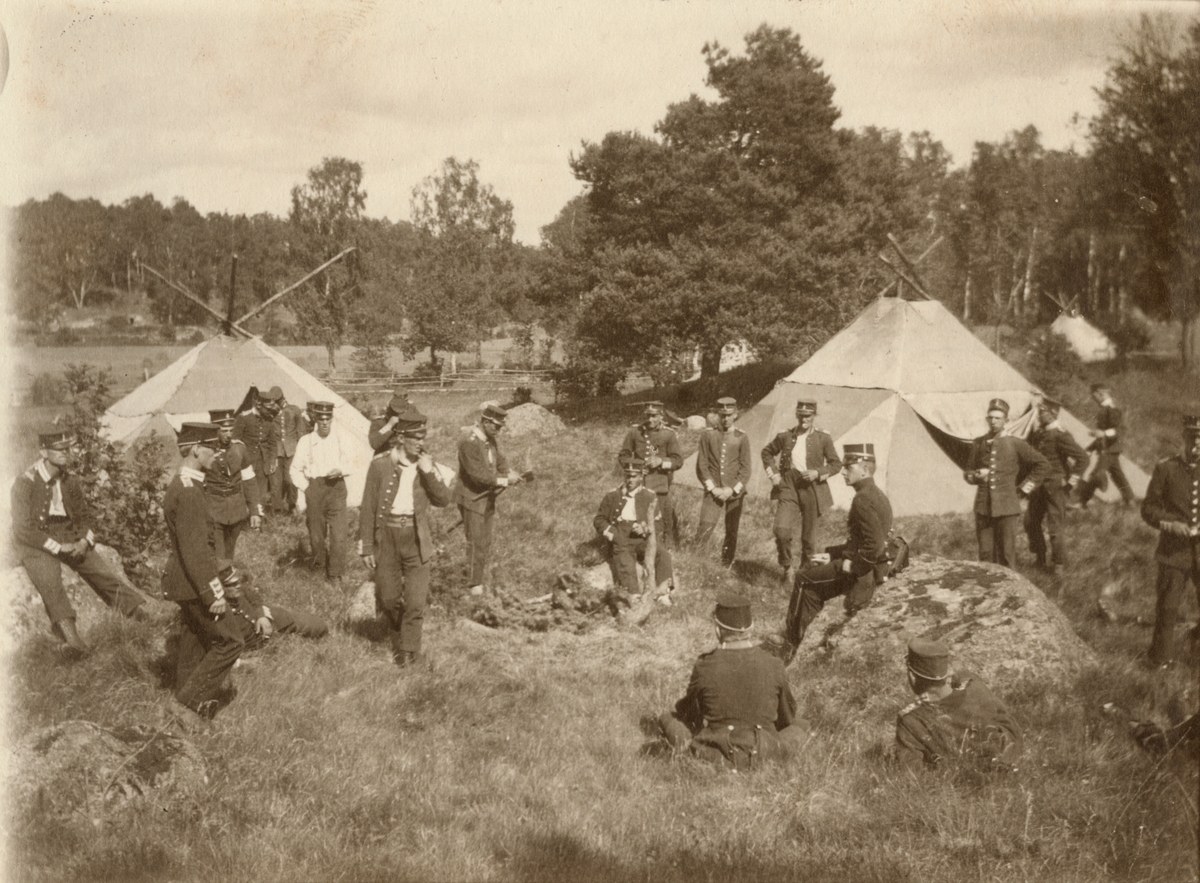 Titel: Gruppbild med soldater från Göta livgarde I 2 framför tältläger.