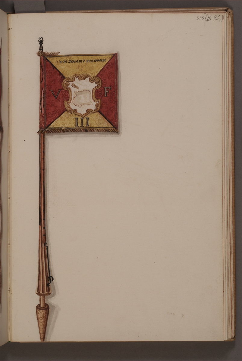 Avbildning i gouache föreställande fälttecken taget som trofé av svenska armén. Det avbildade standaret finns delvis bevarat i Armémuseums samling, för mer information, se relaterade objekt.