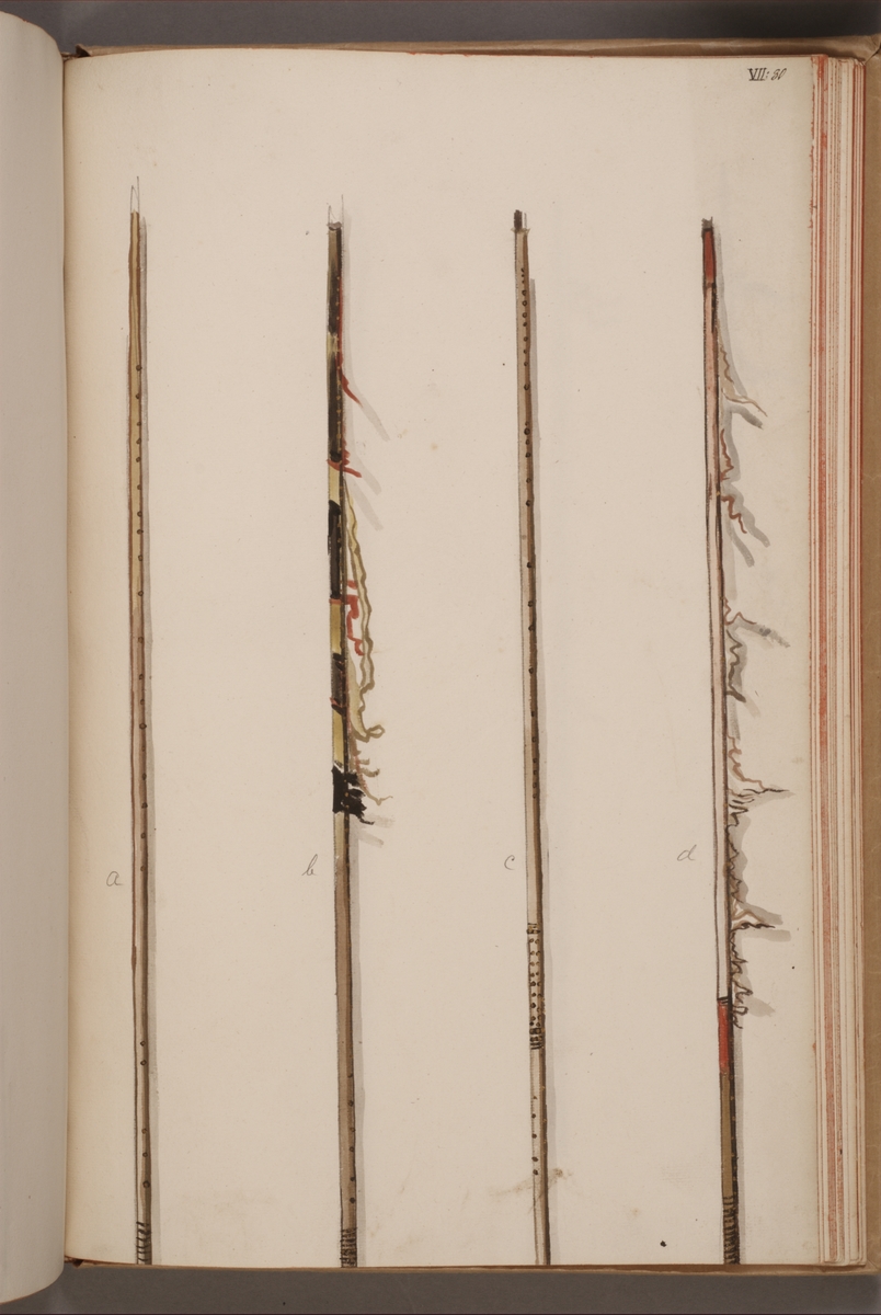 Avbildning i gouache föreställande fanstänger tagna som troféer av svenska armén. Stången näst längst till höger i bild finns bevarad i Armémuseums samling, för mer information, se relaterade objekt.