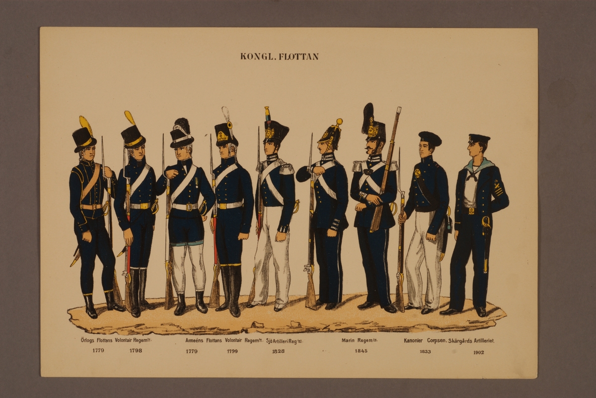Plansch i färgtryck med uniform för Flottan för åren 1779-1902. Ingår i planschsamlingen Svenska krigsmaktens fordna och nuvarande munderingar utgiven av P.B Eklund 1900-1905.