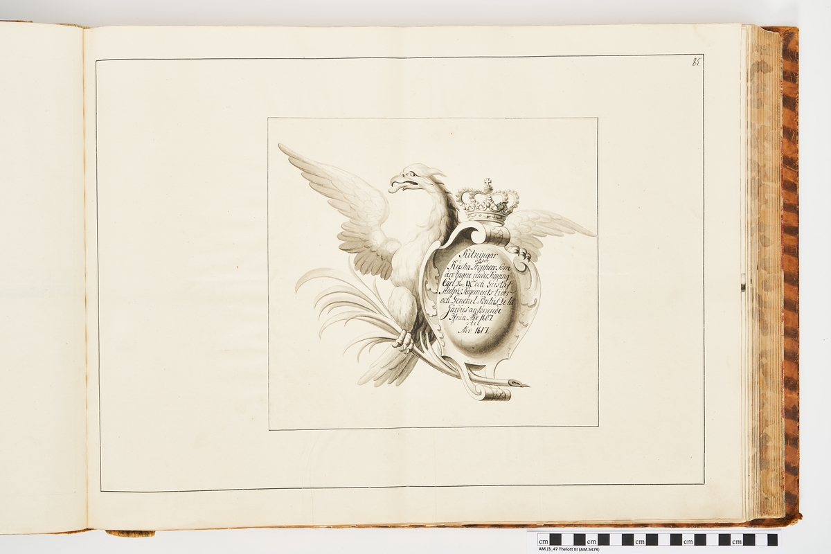 Kartusch till bokverk med avbildningar föreställande äldre svenska eldrör förvarade på fästningar samt eldrör erövrade åren 1598-1679, utförda av syskonen Anna Maria och Philip Jakob Thelott. Avser ritningar över ryska troféer förda ifrån Stora Novgården (Novgorod) den 10 juli 1614.
