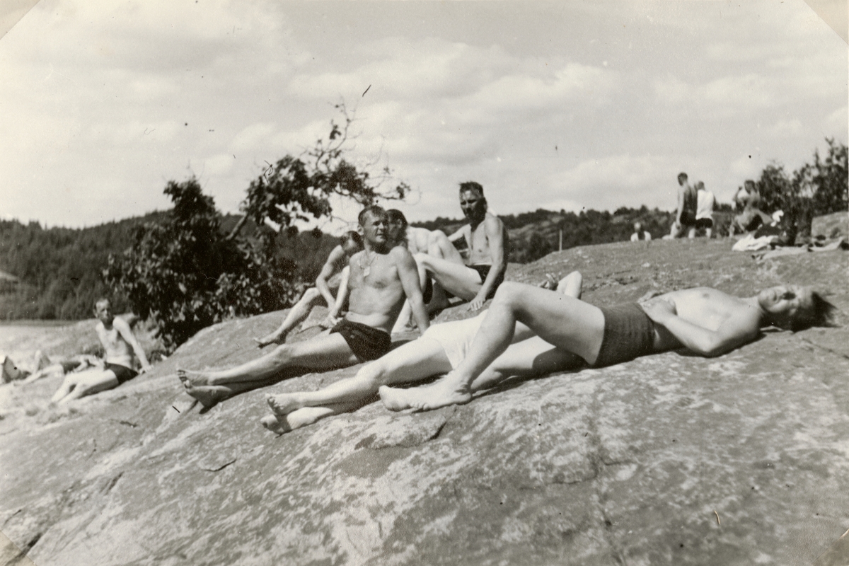 Titel: Soldater solar på strandklipporna.