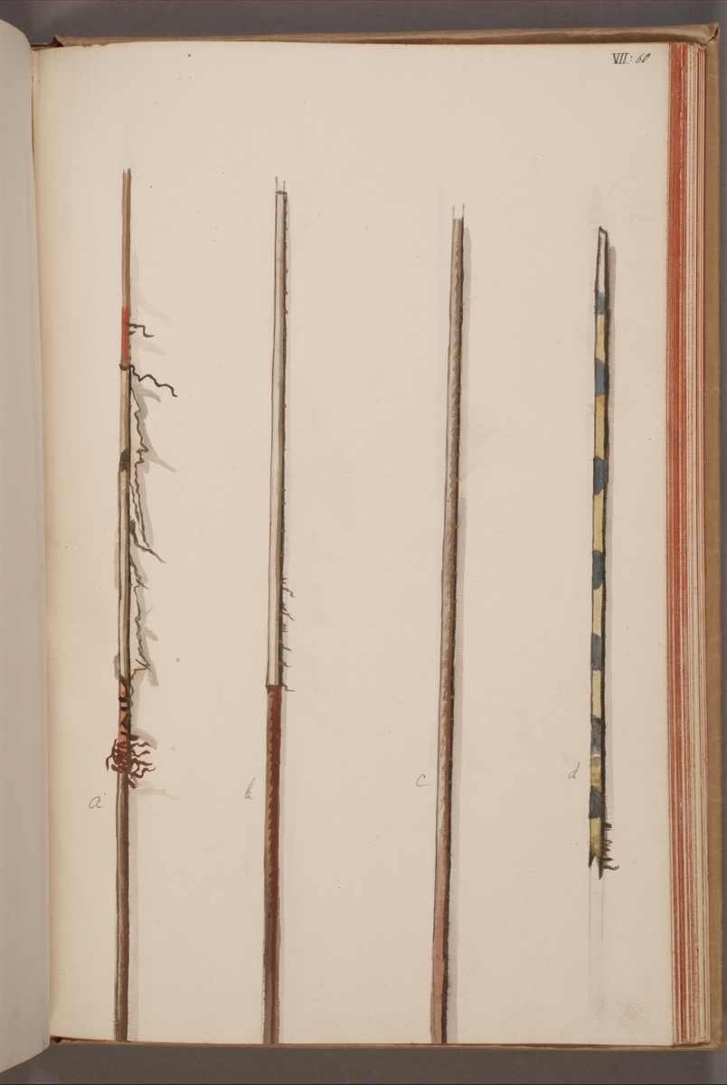 Avbildning i gouache föreställande fanstänger tagna som troféer av svenska armén. De avbildade stängerna finns inte bevarade i Armémuseums samling.