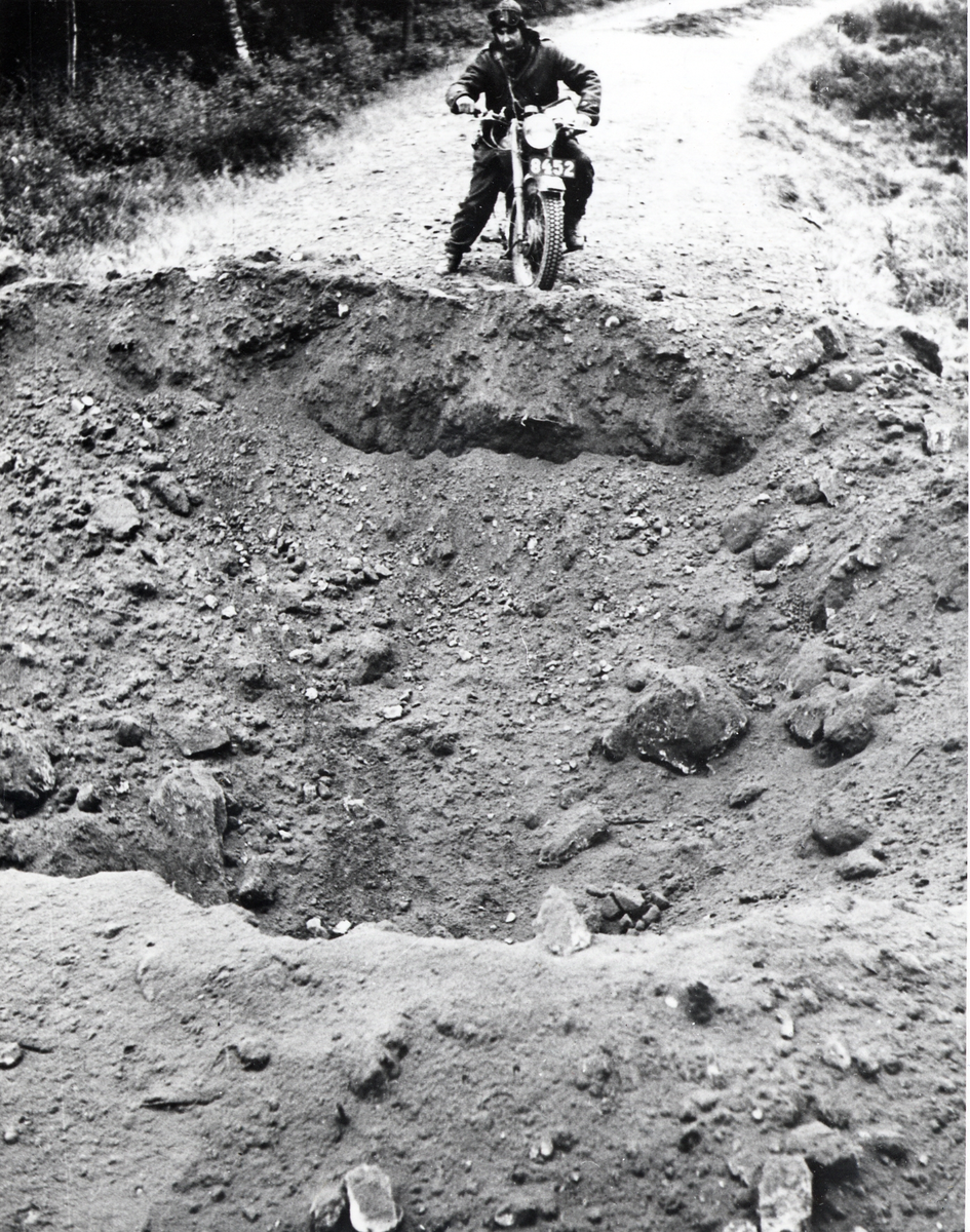 ingenjörstrupper, vägminering, motorcyklist vid en grop i sprängd väg.