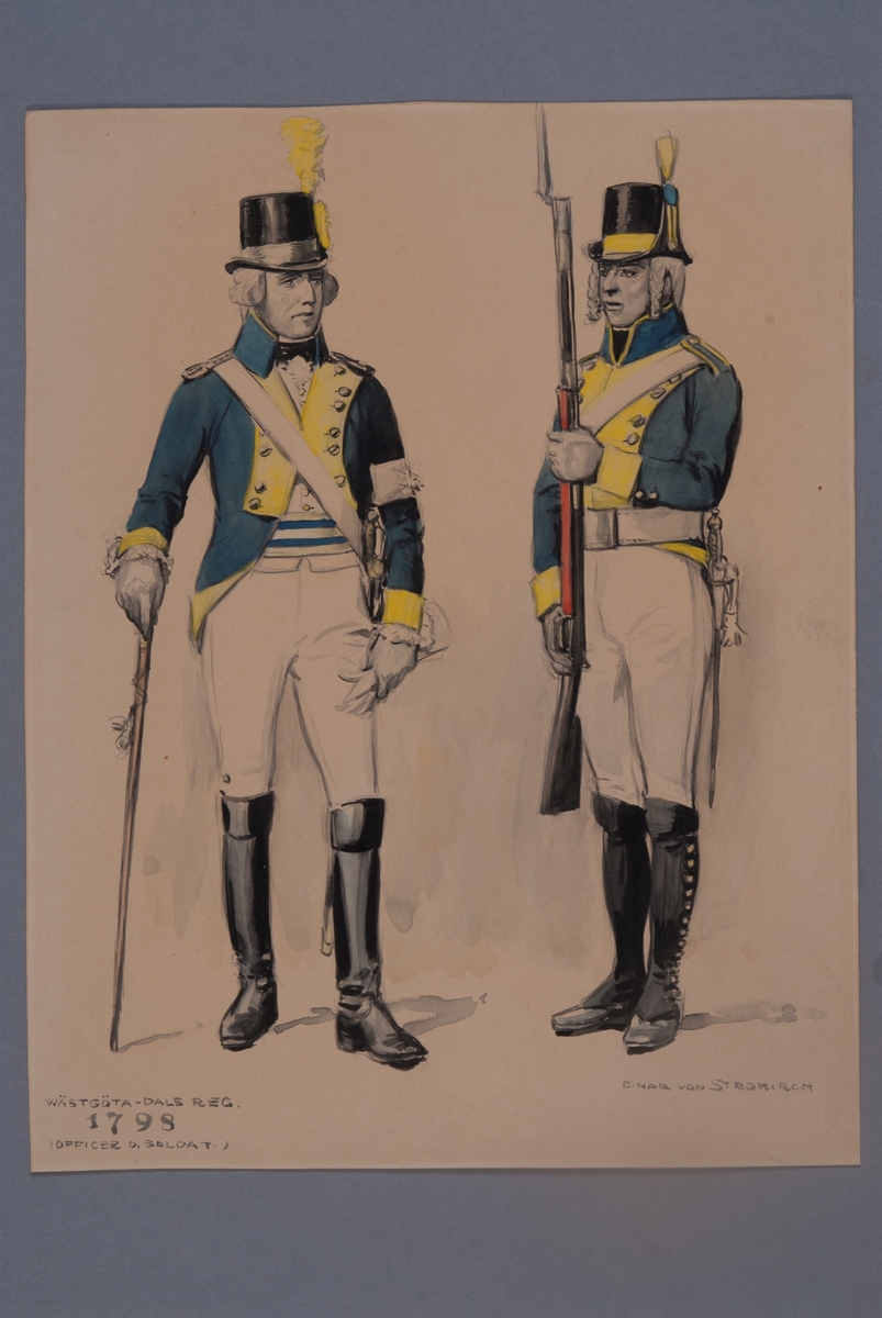 Plansch med uniform för soldat och officer vid Västgöta-Dals regemente för år 1798, ritad av Einar von Strokrich.