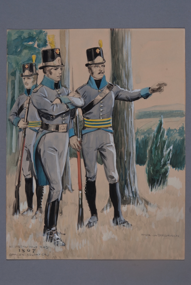 Plansch med uniform för officer och soldater vid Västgöta-Dals regemente för år 1807, ritad av Einar von Strokrich.