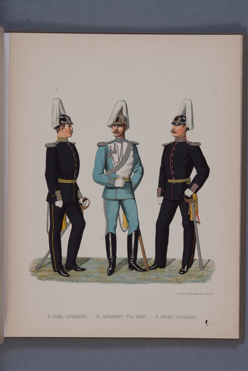 Plansch i färgtryck med uniform för Svea Livgarde, Livgardet till häst och Andra livgardet. Ingår i boken Svenska arméns och flottans uniformer, utgiven av P.B Eklund 1891.
