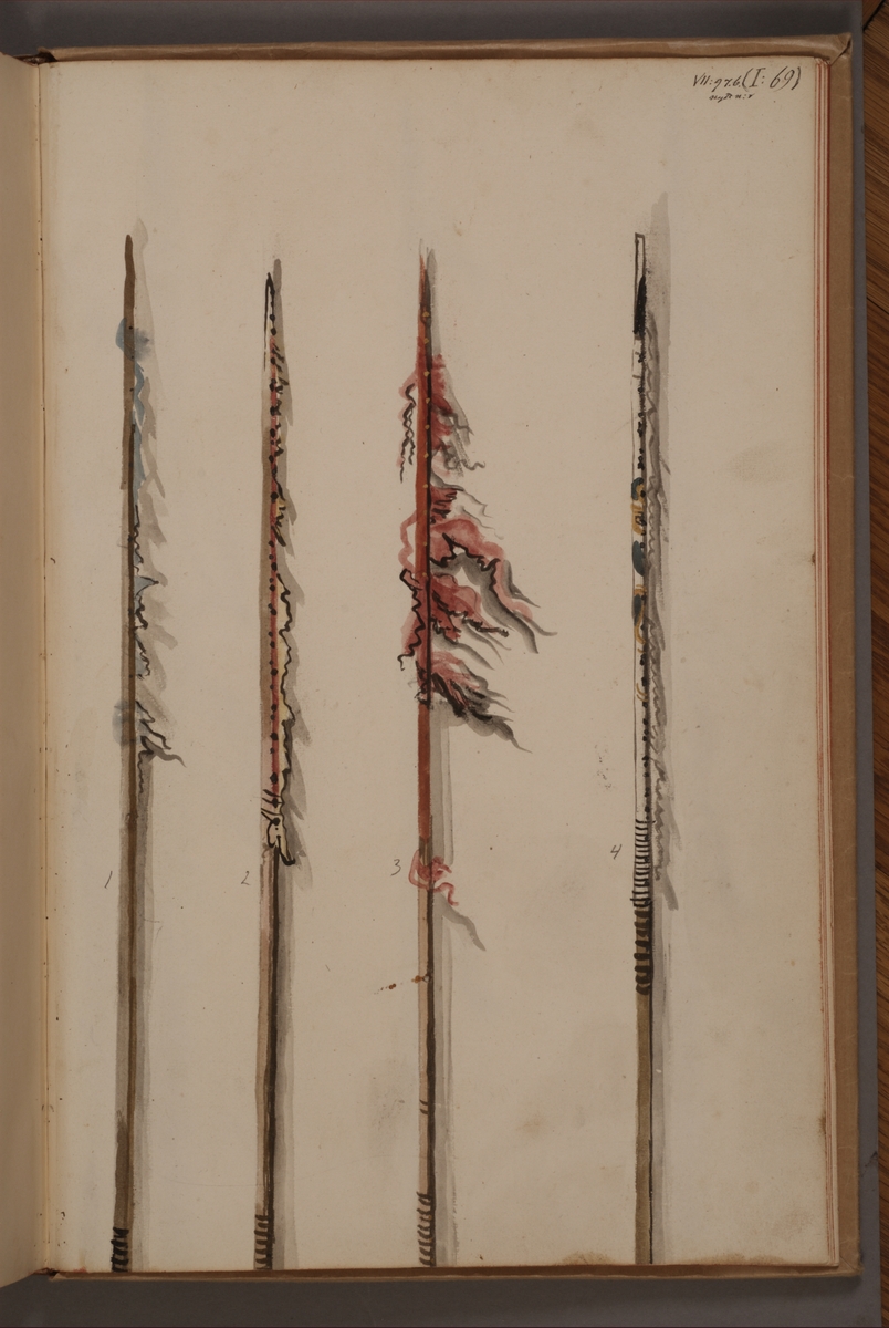 Avbildning i gouache föreställande fanstänger tagna som troféer av svenska armén. Stången längst till höger i bild finns bevarad i Armémuseums samling, för mer information, se relaterade objekt.