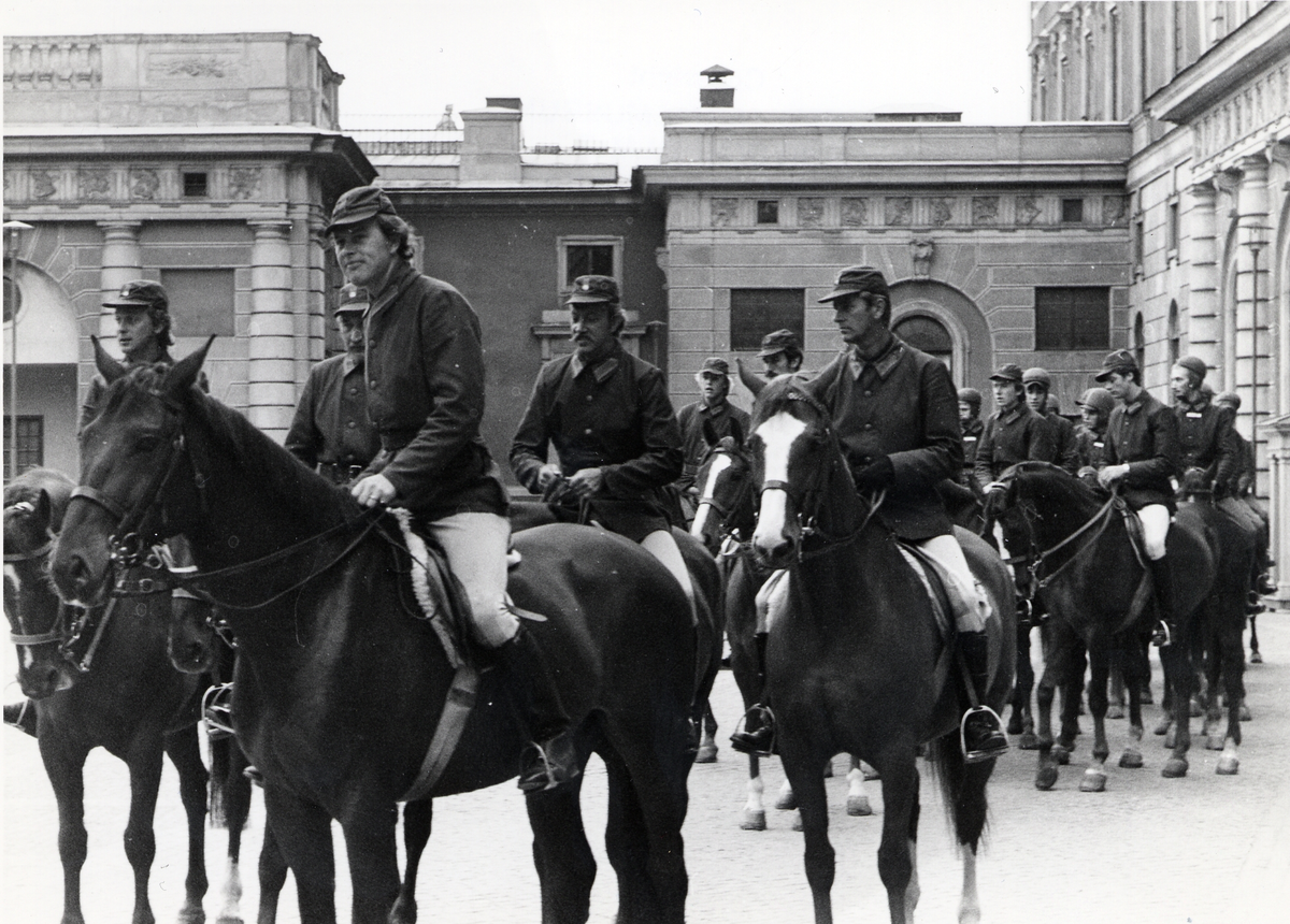 Livgardets dragoner K 1och Hovstallet övar kortegevägen inför kungabröllopet, utanför Yttre borggården, Stockholm.