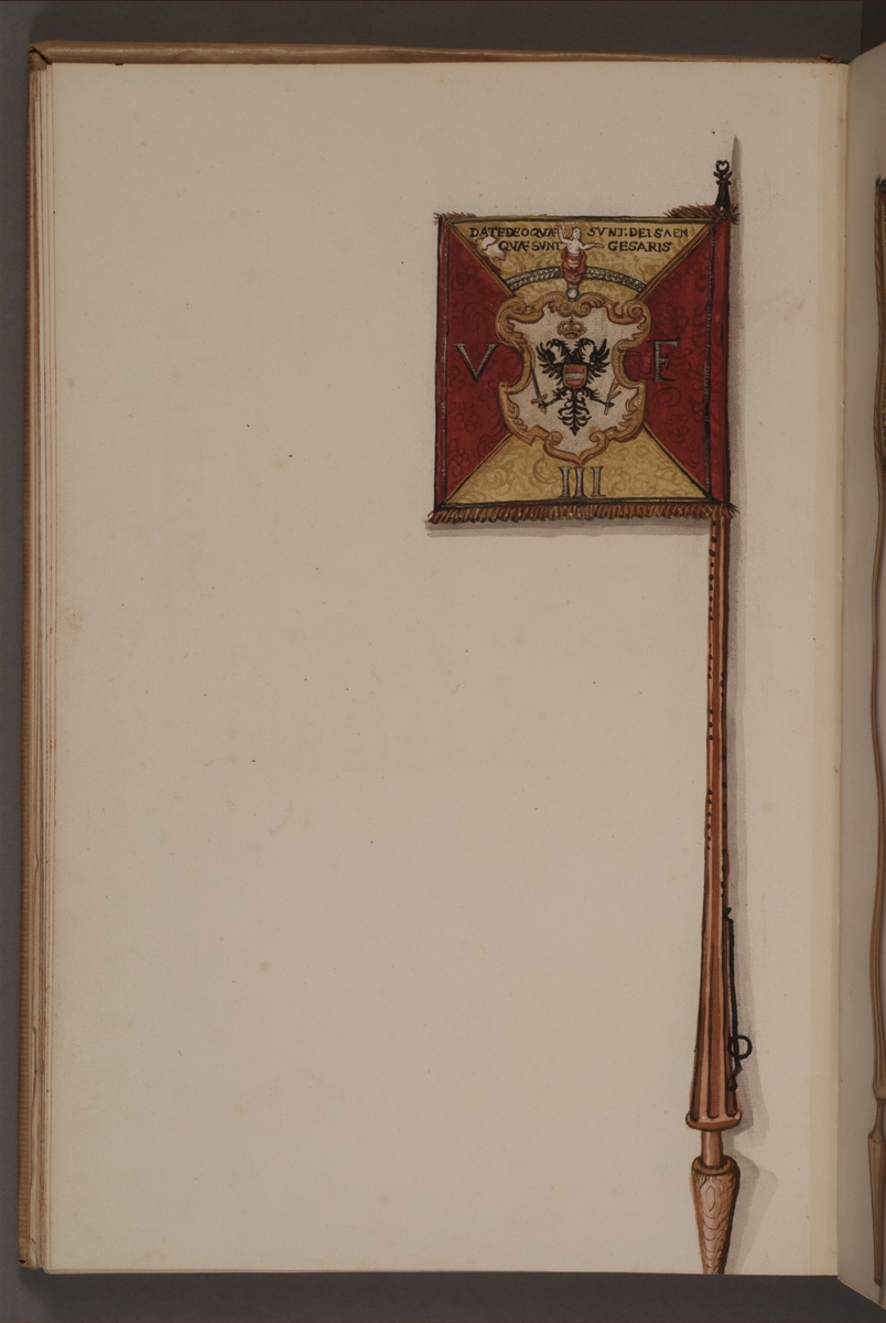 Avbildning i gouache föreställande fälttecken taget som trofé av svenska armén. Det avbildade standaret finns delvis bevarat i Armémuseums samling, för mer information, se relaterade objekt.