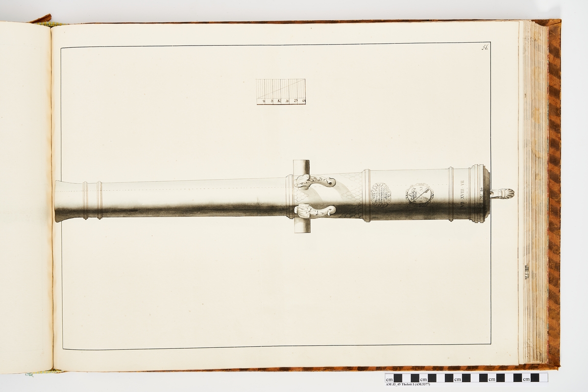 Avbildning föreställande eldrör återtaget som trofé av den svenska armén i slaget vid Narva den 20 november 1700. Ingår i volym med avbildade kanontroféer tagna åren 1700-1702.