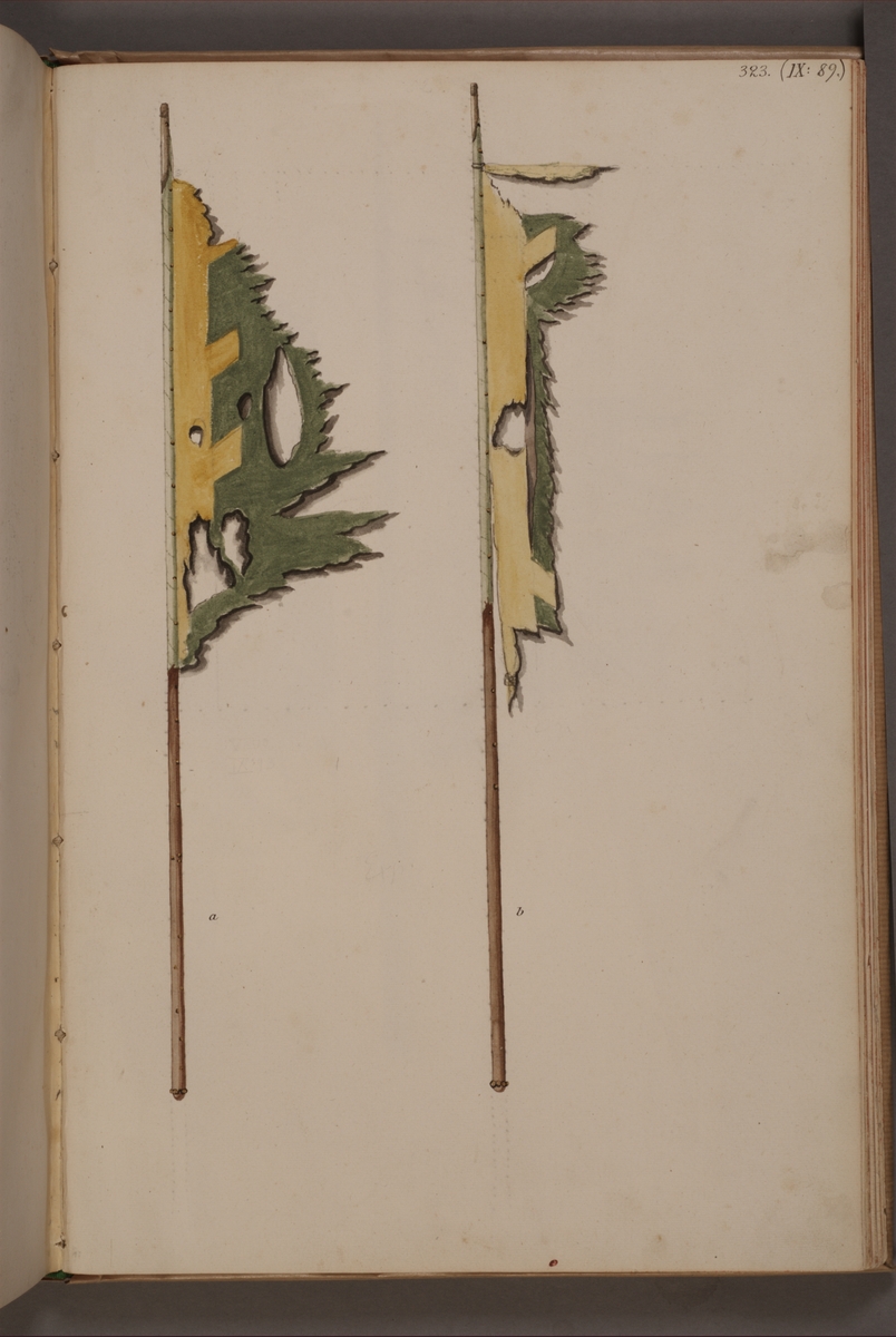Avbildning i gouache föreställande fanor tagna som troféer av svenska armén. De avbildade fanorna finns inte bevarade i Armémuseums samling.