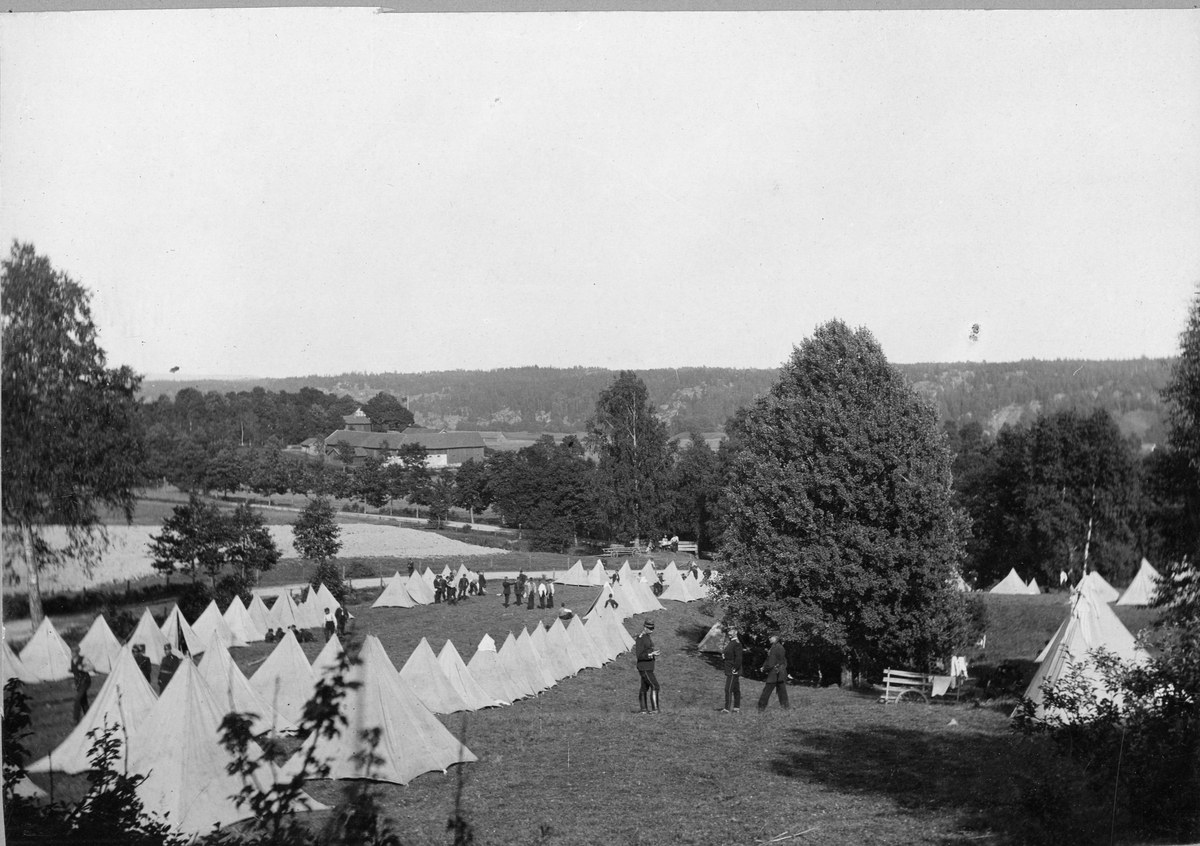 Soldater ur Älvsborgs regemente I 15 står bland tälten på Fristad hed.