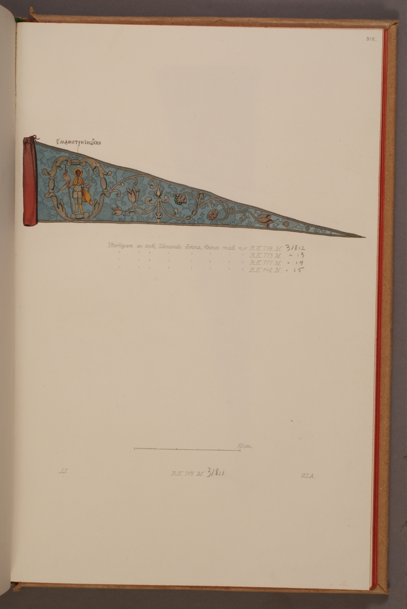 Avbildning i gouache föreställande fälttecken taget som trofé av svenska armén. Den avbildade vimpeln finns bevarad i Armémuseums samling, för mer information, se relaterade objekt.