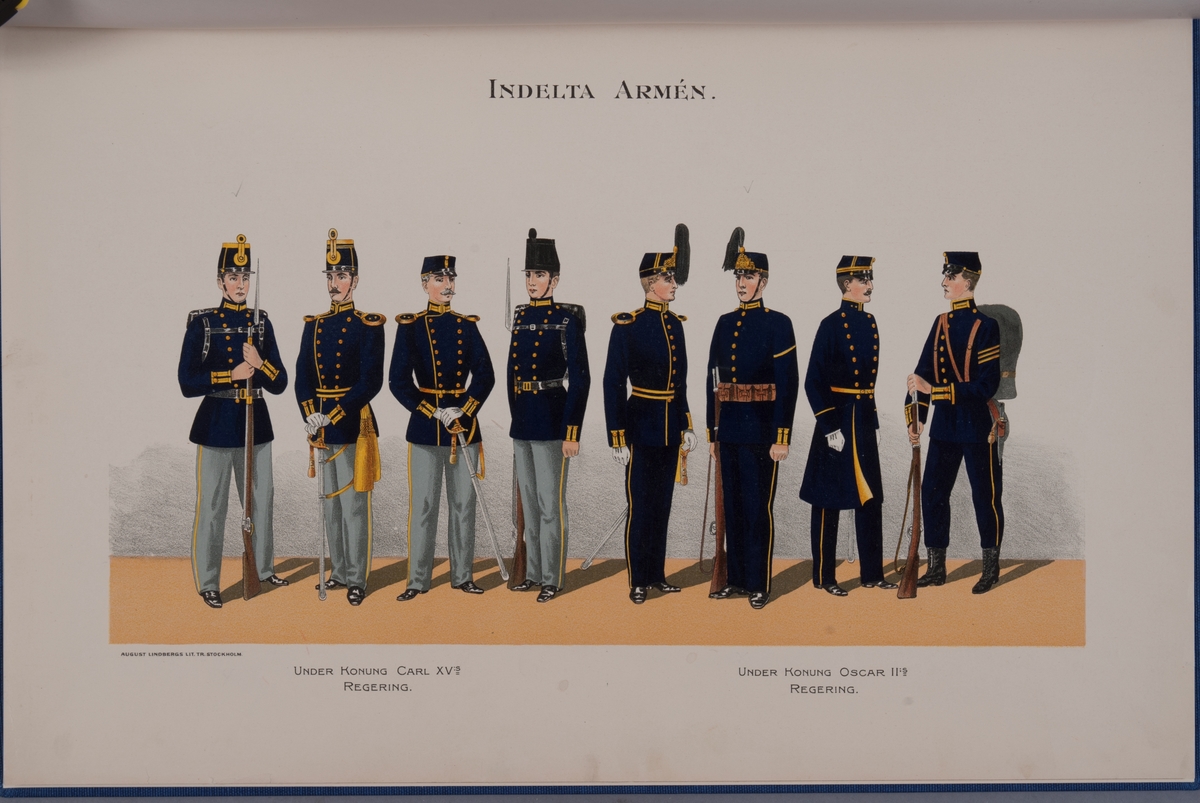Plansch med uniform för Indelta armèn under Karl XV och Oscar II regering. Ingår i boken Svenska krigsmakten under konungarna Carl XIV Johan, Oscar I, Karl XV, Oscar II, utgiven av P.B. Eklund.