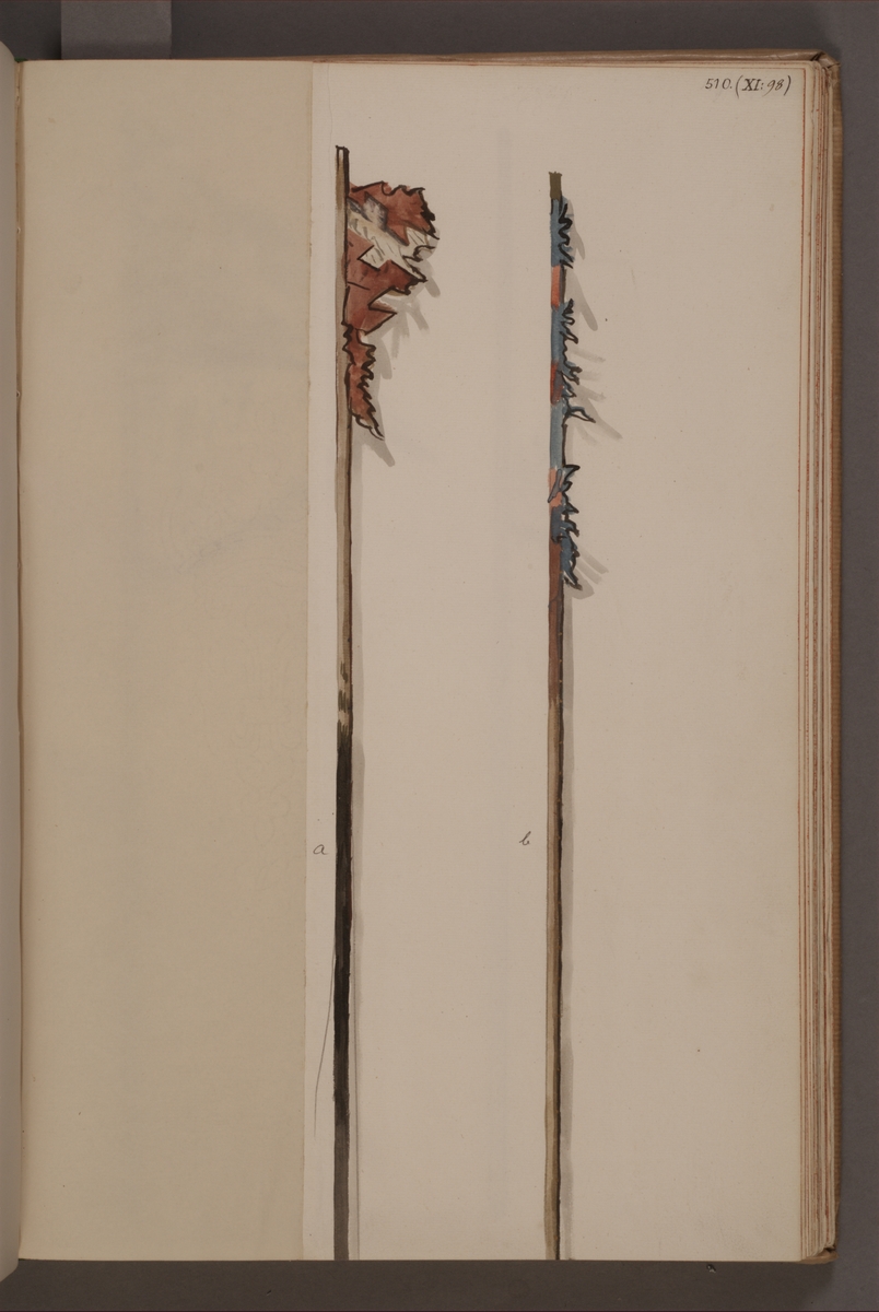 Avbildning i gouache föreställande fälttecken tagna som trofé av svenska armén. De avbildade standaren finns inte bevarade i Armémuseums samling.