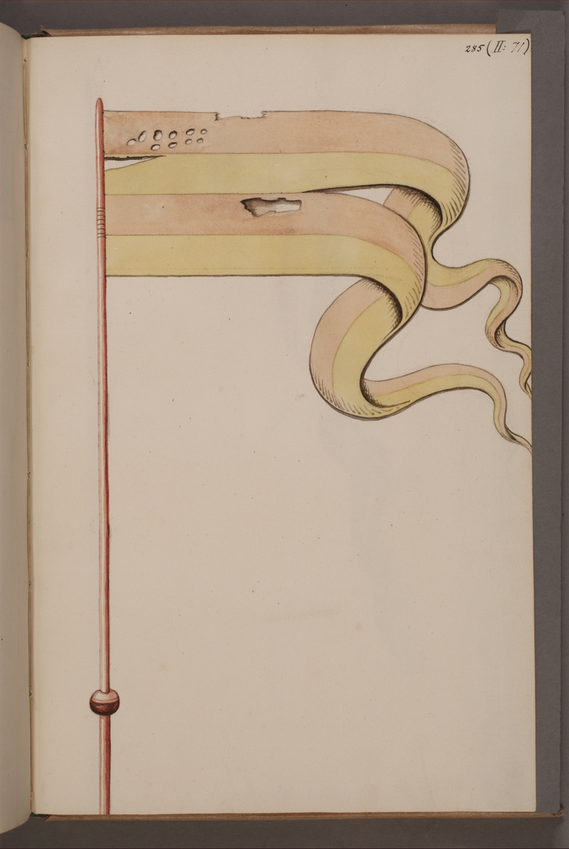 Titel: Avbildning i gouache föreställande fälttecken taget som trofé av svenska armén. Den avbildade fanan finns inte bevarad i Armémuseums samling.
