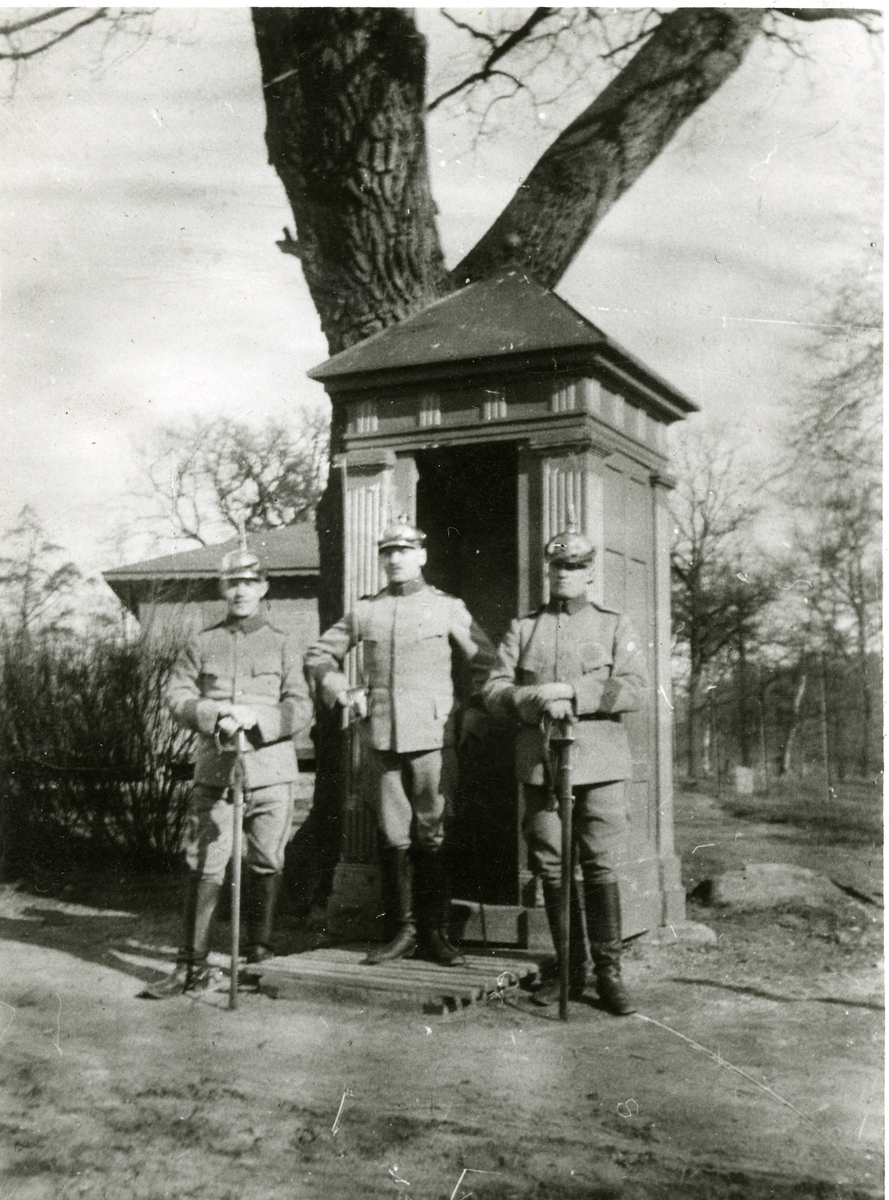 Tre man uppställda framför vaktkur, från C. A. Strandmans tid vid Livskvadronen, Livgardet till häst K 1, år 1915.