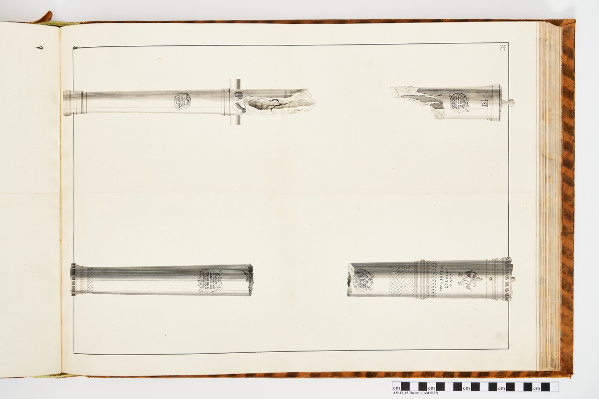 Titel: Avbildning föreställande eldrör tagna som troféer av den svenska armén med fästningen Kokenhusen 11 juli 1701. Ingår i volym med avbildade kanontroféer tagna åren 1700-1702.