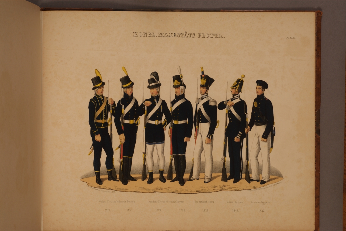 Plansch med uniform för Majestäts flotta för åren 1779-1833. Plansch i färgtryck efter original av Adolf Ulrik Schützercrantz. Ingår i planschsamlingen Svenska krigsmaktens fordna och närvarande munderingar.