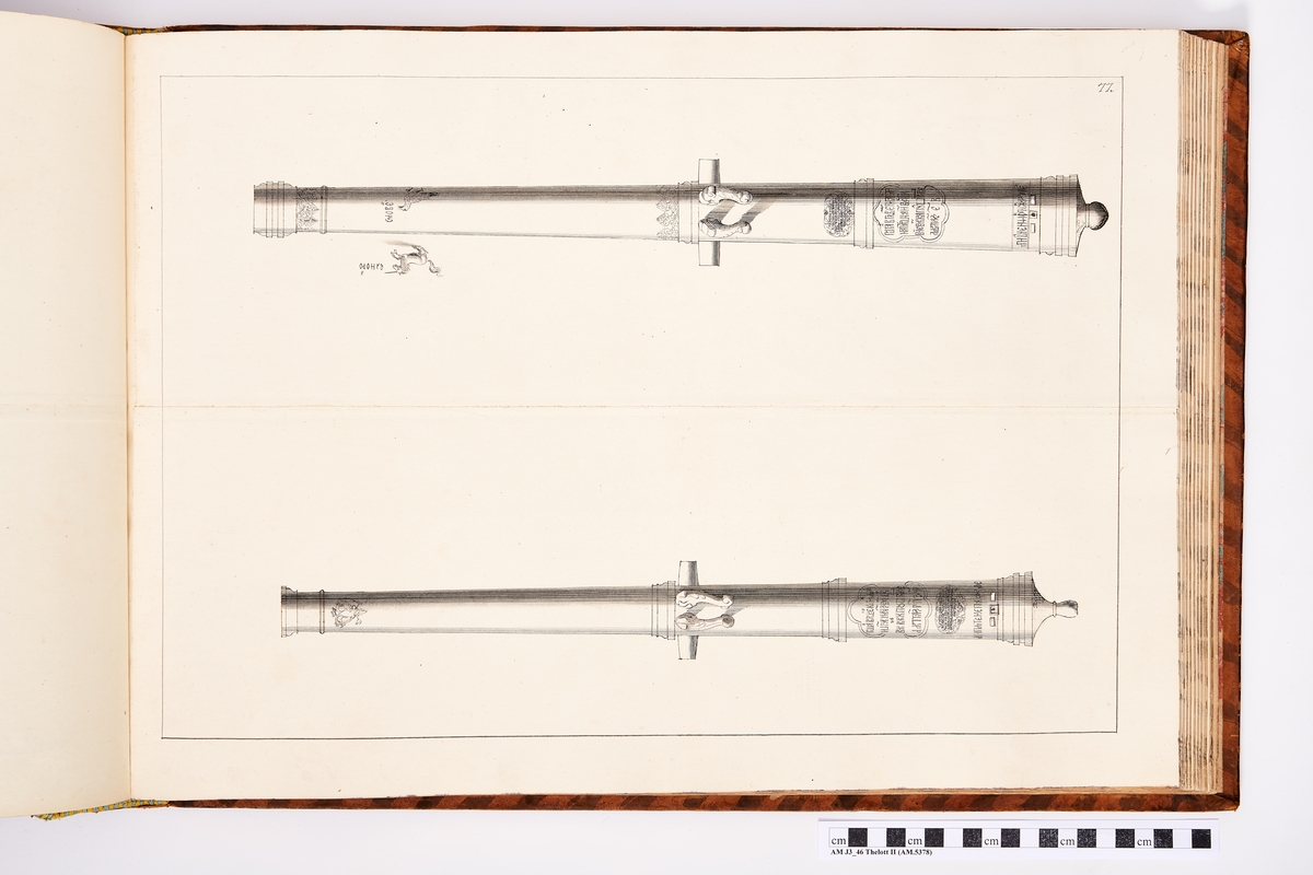 Avbildning föreställande eldrör tagna som troféer av den svenska armén vid Jakobstadt den 20 juli 1704 under general Adam Leijonhufvuds (Lewnhaupt) anförande. Ingår i volym med avbildade kanontroféer tagna åren 1703-1706.