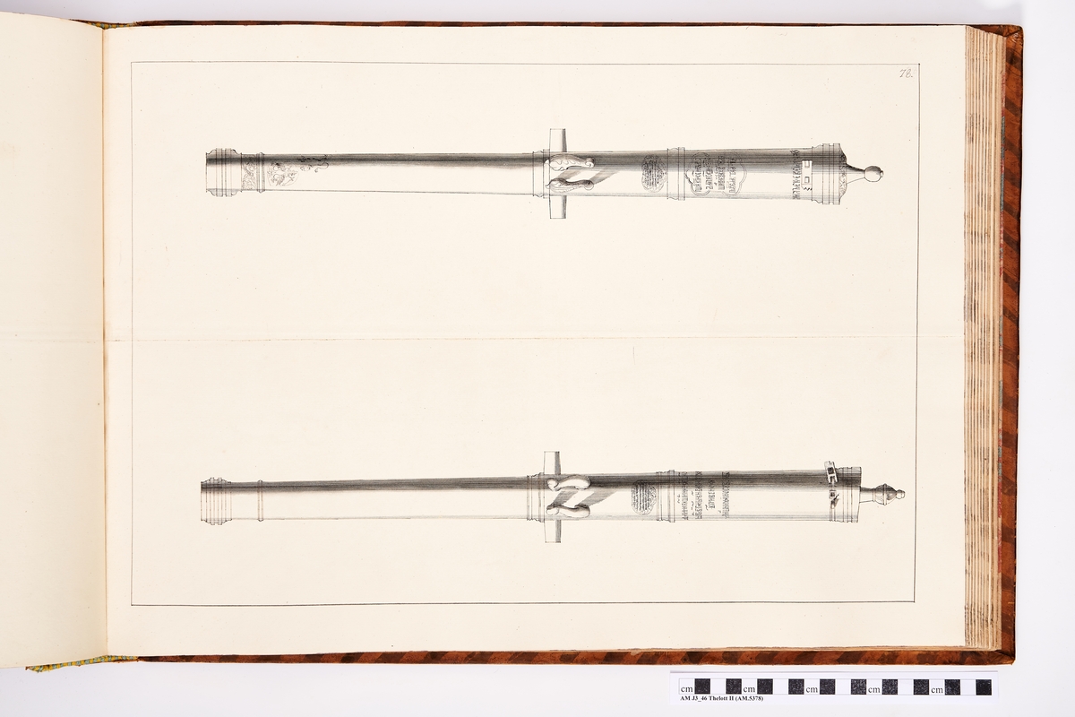 Titel: Avbildning föreställande eldrör tagna som troféer av den svenska armén vid Jakobstadt den 20 juli 1704 under general Adam Leijonhufvuds (Lewnhaupt) anförande. Ingår i volym med avbildade kanontroféer tagna åren 1703-1706.
